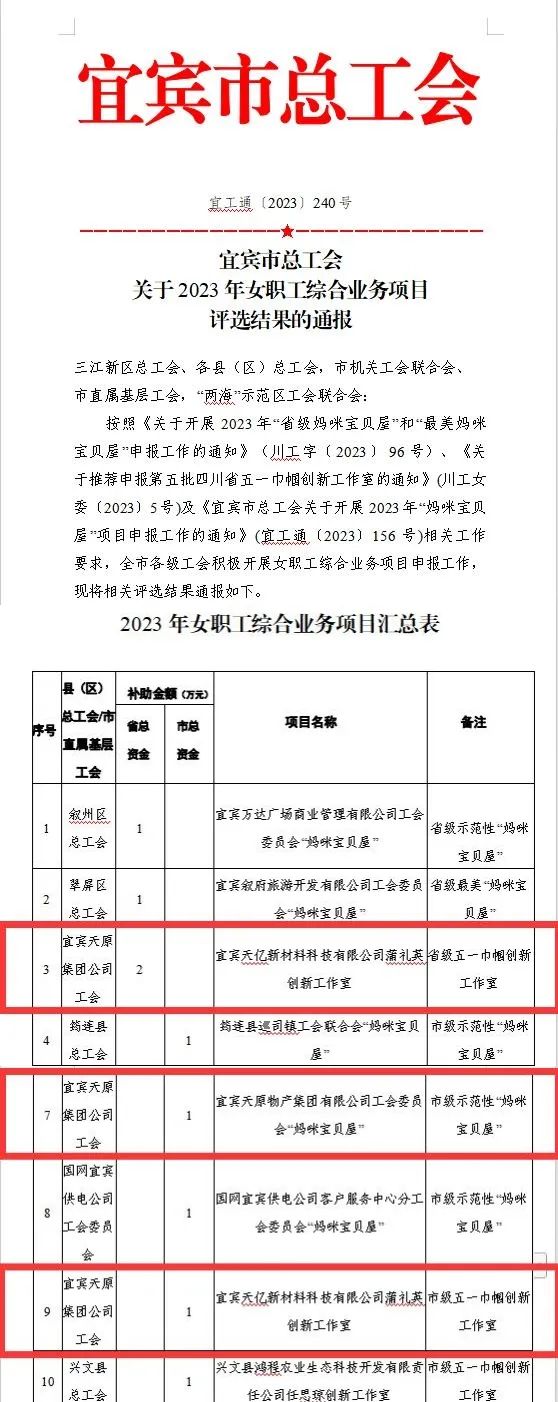 近日,宜賓市總工會(huì )公布了2023 年女職工綜合業(yè)務(wù)項目評選結果,天原集團多個(gè)項目榜上有名,其中,下屬宜賓天億新材料科技有限公司蒲禮英創(chuàng )新工作室榮獲“省級五一巾幗創(chuàng )新工作室”“市級五一巾幗創(chuàng )新工作室”兩項稱(chēng)號,下屬宜賓天原物產(chǎn)集團有限公司工會(huì )委員會(huì )“媽咪寶貝屋”榮獲市級示范性“媽咪寶貝屋”稱(chēng)號。